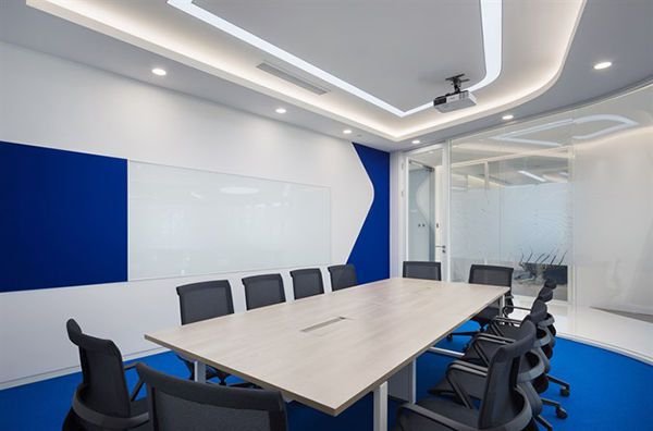 设计师将前台设计为形成弧线的引导,很自然地将人们的视线导向一旁的综合休息区。舒适的沙发,几只随意摆放的休闲座椅,既有自由开放的公共空间,也可以供1-2人安静地交流思考。标志性的红蓝色沙发,具备优雅及时尚气息成为空间配色,在简约明亮的雅白色的主调中,彰显活力。在天花板的采光部分使用了软膜天花的工艺包裹光源,避免了直角线条的生硬,贯穿了曲线绵延的视觉效果。在地面的处理上,地毯切割弧度呈现出的流线感与天花灯带交相辉映,并将这一设计带入整个办公空间。一步一景亦融合,令整个空间层次起伏并生动有趣。
